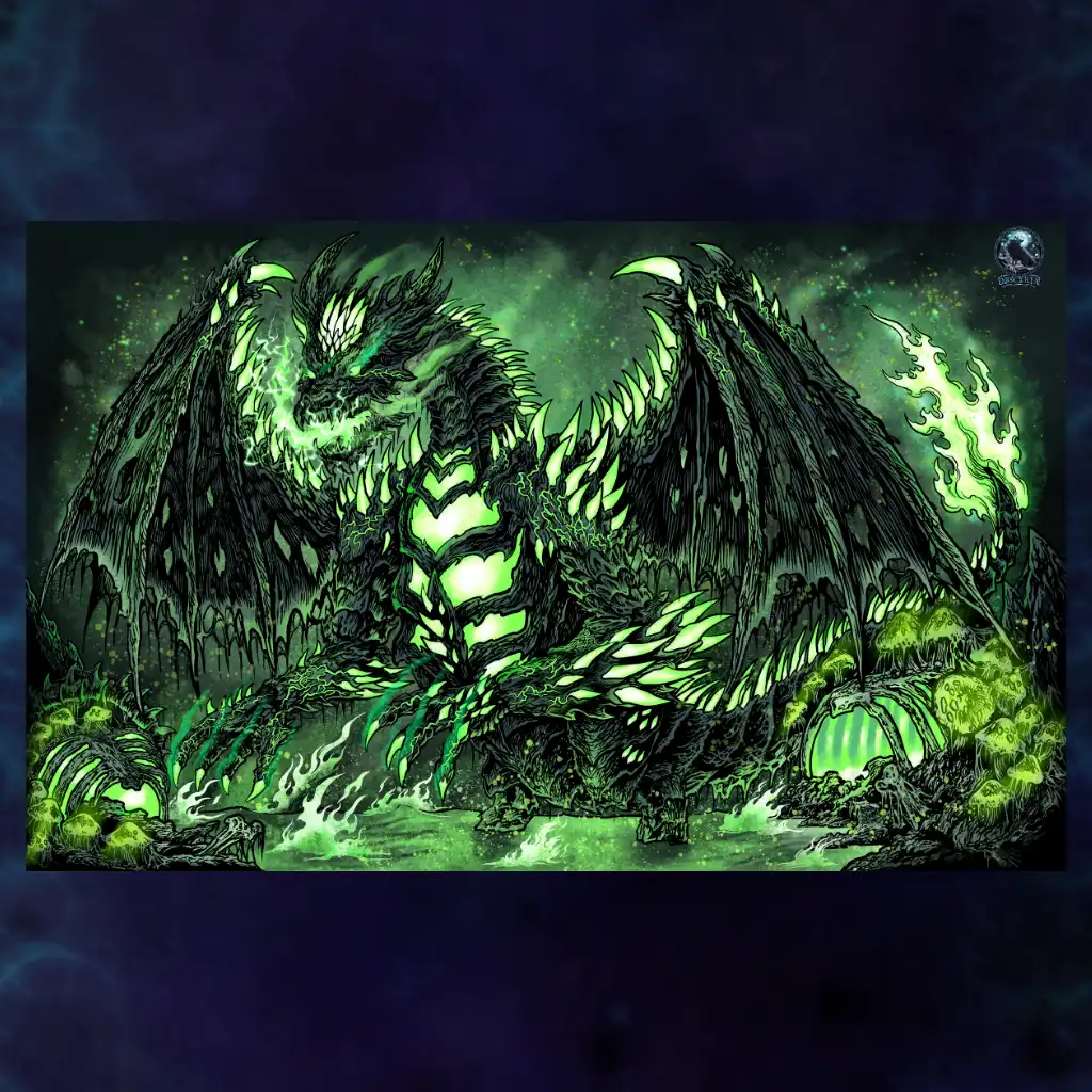 Veredelt mit UV-Lack beginnt sein Essenzkern im Licht zu pulsieren. Das giftige Leuchten tritt hervor, als würde der Morast selbst durch das Papier sickern.